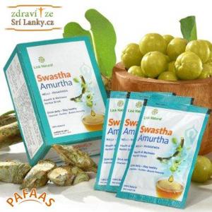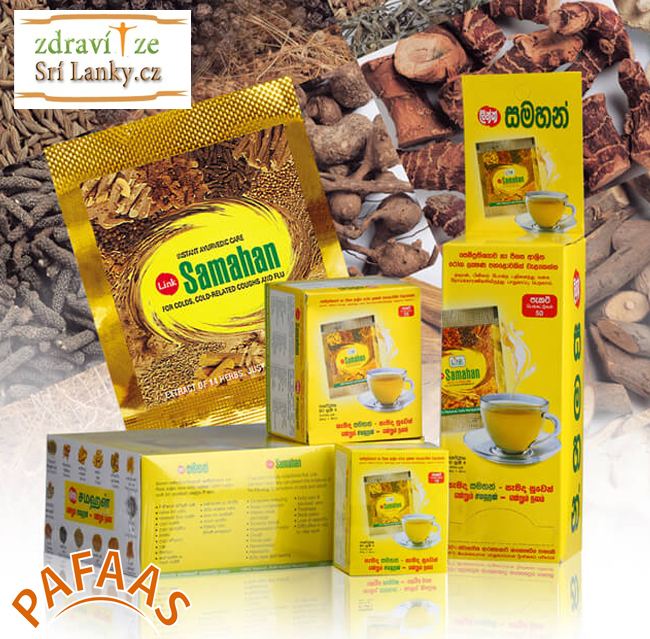 Ájurvédsky bylinný nápoj Swastha Amurtha je kombinací dvou bylin – Neli – Rasakinda (amalaki a guduči) Složení: Smuteň lékařská (Amalaki, Amla), Chebule srdčitá (Guduchi), třtinový cukr. Ttvoří vyvážený doplněk stravy vhodný pro posílení obranyschopnosti a snížení horečky. Výborně působí proti bolesti hlavy a kloubů. Obsahuje několik důležitých antioxidantů. Patří mezi adaptogeny a přispívá k normální funkci dýchacího systému, trávení, močových cest, jater i kloubů. Nápoj Swastha Amurtha je koncentrovaný, vodou ředitelný rostlinný přípravek, který přispívá k celkové relaxaci a fyzické i duševní pohodě. Swastha Amurtha podporuje imunitu, proto jej tradiční medicína doporučuje pít pravidelně pro udržení zdraví i jako prevenci proti vzniku onemocnění. Výborně se hodí jako podpora imunity při počátečních příznacích chřipkového onemocnění. Swastha Amurtha napomáhá při očistě organismus a detoxikaci, příznivě působí na imunitu, podporuje trávení, pomáhá redukovat bolest kloubů a uvolňuje zátěž očí. Použití: Obsah 1 sáčku zalijte 100 ml horké vody. Nápoj můžete pít teplý i studený. Doporučená denní dávka je 1- 4 sáčky. Samahan - Příprava: 1 sáček rozpusťte ve 100 ml vroucí vody nebo čaje. Složení: Adhatoda vasica (kořen), Alpinia galanga (galgán – oddenek), Carum copticum (kmín koptský – oddenek), Coriandrum sativum (koriandr setý – semeno), Coscinium fenestratum (kalumbské dřevo – stopka), Cuminum cyminum (římský kmín – semeno), Evolvulus alsinoides (vyvinutec – celá rostlina), Glycyrrhiza glabra (lékořice lisá – stopka), Hedyotis corymbosa (celá rostlina), Piper longum (pepř dlouhý – plod), Piper nigrum (pepř černý – plod), Premna herbacea (kořen), Solanum xanthocarpum (celá rostlina), Zingiber officinale (zázvor lékařský – oddenek), Premna herbacea (kořen), třtinový cukr. Doporučené denní množství: 4 sáčky Informace dle nařízení Evropského parlamentu a Rady (EU): Doplněk stravy - Upozornění: Není určeno pro děti, těhotné a kojící ženy. Uchovávejte mimo dosah dětí! Nepřekračujte doporučené dávkování. Není určeno jako náhrada pestré stravy. Uchovávejte na suchém a temném místě při pokojové teplotě. Dovoze: František Pavlišta/Pafaas, Hlavice 3, 46348, Všelibice, IČO: 41349652