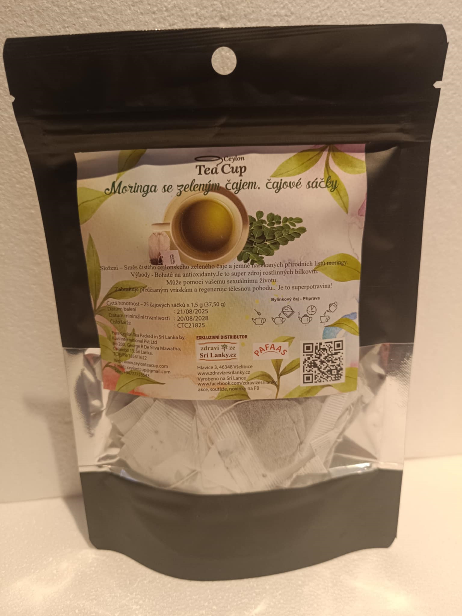 1 x MORINGA čaj 25 sáčků Složení: Moringa olejodárná (Moringa oleifera) Moringa je považována za superpotravinu pro její nutriční kvality a vysoký antioxidační, protizánětlivý a ochranný efekt. Ve východních kulturách byla používána jako prostředek k prevenci onemocnění jako je diabetes, respirační a kardiovaskulární onemocnění, zažívací potíže, anémie, artritida a další. Vodní výluh (čaj) z moringy obsahuje vysokou koncentraci látek s antioxidační kapacitou, které zabraňují nebezpečné oxidaci molekul vrámci buněk organismu. Kromě antioxidantů mají hojné zastoupení protizánětlivé fytonutrienty, které zabraňují působení zánětlivých faktorů a zmírňují tak probíhající zánětlivé procesy, případně působí preventivně. Významným účinkem čaje je také pozitivní efekt na hladinu tuků a glukózy a regulaci oxidačního stresu u diabetiků. Mnohé studie poukázaly na příznivý vliv pití čaje na hladinu krevního cukru, jakož i ochranu kardiovaskulárního systému. Rozhodně byste si měli čaj připravit i během probíhajících běžných onemocnění, ale i jako prevence proti nim - moringa má antibakteriální účinky a zároveň podporuje naši imunitu. Pravidelným konzumováním Moringy můžete dosáhnout to, co potřebuje každý namáhaný organismus - proces čištění, uzdravování a revitalizace všech tělesných orgánů. Lahodný žlutozelený voňavý nápoj Vám napomůže i k lepší náladě a vyrovnanosti. Dle současné legislativy EU u bylinek a bylinných produktů nesmíme uvádět podrobnější informace, které by v nás mohly vzbudit dojem zdravotního nebo léčebného účinku bylin - byť se ony bylinky používají stovky let a pomohly miliónům lidí. Nesmíme již uvádět ani vědeckými výzkumy prokázané účinky bylin, pokud se nejedná o farmaceutickou firmou registrovaný lék. Informace dle nařízení Evropského parlamentu a Rady (EU): Doplněk stravy - Upozornění: Není určeno pro děti, těhotné a kojící ženy. Uchovávejte mimo dosah dětí! Nepřekračujte doporučené dávkování. Není určeno jako náhrada pestré stravy. Uchovávejte na suchém a temném místě při pokojové teplotě. Dovoze: František Pavlišta/Pafaas, Hlavice 3, 46348, Všelibice, IČO: 41349652