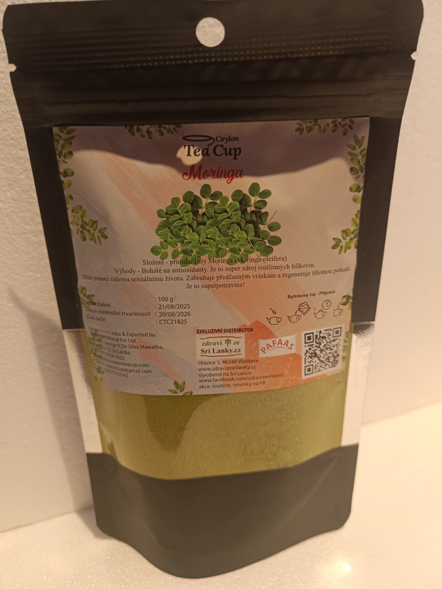 Moringa Powder (prášek) - balení 100 g superpotravina Složení Moringa (Moringa oleifera): Původně pochází z Indie, kde je již po tisíciletí používána v ajurvédské medicíně. Obsahuje velké množství vitamínů, minerálů a mikrominerálů, antioxidanty, protizánětlivé látky, chlorofyl, beta karoteny, flavonoidy, aminokyseliny a více než 90 užitečných sloučenin. Je známá jako nejvýživnější a nejsilnější super potravina vůbec. Má velmi příznivý vliv na celkové zdraví. Dodává energii a zvyšuje odolnost organismu Dle současné legislativy EU u bylinek a bylinných produktů nesmíme uvádět podrobnější informace, které by v nás mohly vzbudit dojem zdravotního nebo léčebného účinku bylin - byť se ony bylinky používají stovky let a pomohly miliónům lidí. Informace dle nařízení Evropského parlamentu a Rady (EU): Doplněk stravy - Upozornění: Není určeno pro děti, těhotné a kojící ženy. Uchovávejte mimo dosah dětí! Nepřekračujte doporučené dávkování. Není určeno jako náhrada pestré stravy. Uchovávejte na suchém a temném místě při pokojové teplotě. Dovoze: František Pavlišta/Pafaas, Hlavice 3, 46348, Všelibice, IČO: 41349652