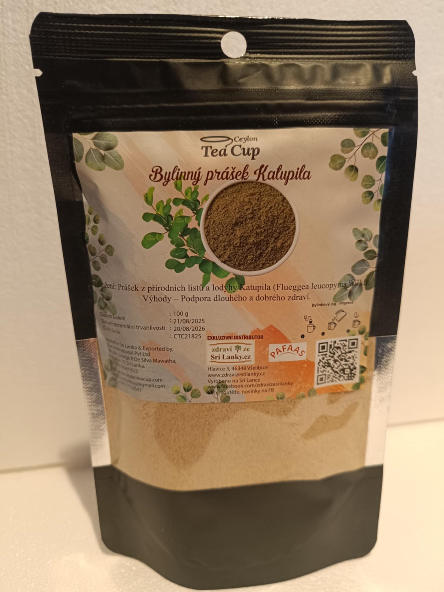 Složení: Katupila (Securinega leucopyrus), zelený čaj (Camellia sinensis) Osvědčená bylina v ajurvédě pro prevenci. Dle současné legislativy EU u bylinek a bylinných produktů nesmíme uvádět podrobnější informace, které by v nás mohly vzbudit dojem zdravotního nebo léčebného účinku bylin - byť se ony bylinky používají stovky let a pomohly miliónům lidí. Nesmíme již uvádět ani vědeckými výzkumy prokázané účinky bylin, pokud se nejedná o farmaceutickou firmou registrovaný lék. Informace dle nařízení Evropského parlamentu a Rady (EU): Doplněk stravy - Upozornění: Není určeno pro děti, těhotné a kojící ženy. Uchovávejte mimo dosah dětí! Nepřekračujte doporučené dávkování. Není určeno jako náhrada pestré stravy. Uchovávejte na suchém a temném místě při pokojové teplotě. Dovoze: František Pavlišta/Pafaas, Hlavice 3, 46348, Všelibice, IČO: 41349652 Katupila prášek 100g