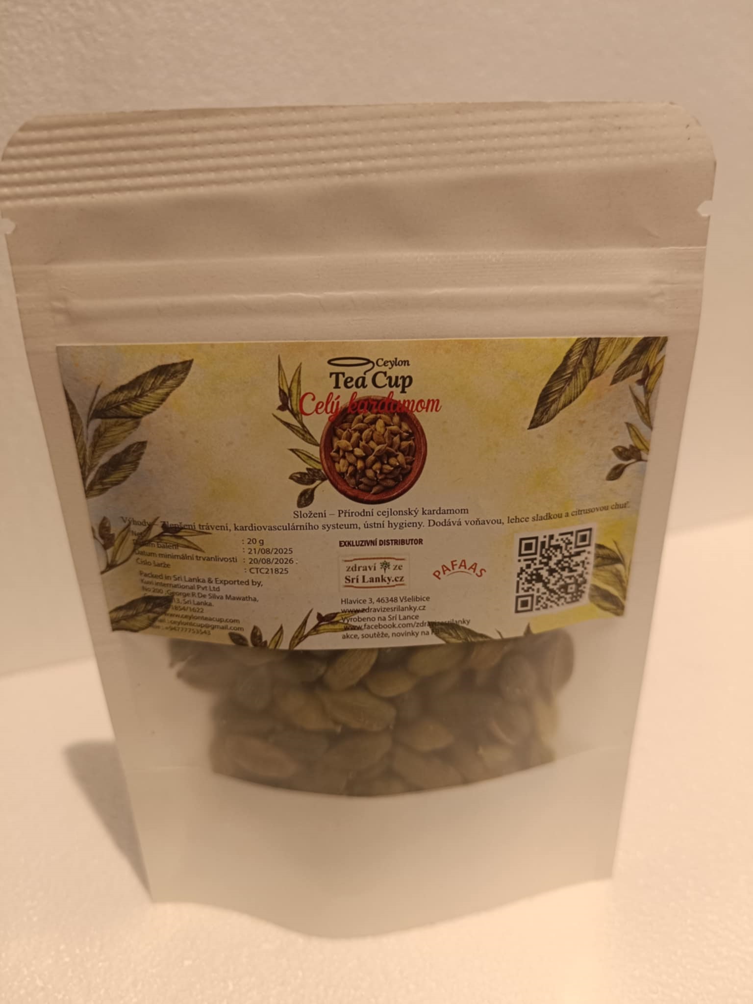 Složení – Přírodní cejlonský kardamom. Zlepšení trávení, kardiovasculárního systeum, ústní hygieny. Dodává voňavou, lehce sladkou a citrusovou chuť. Dle současné legislativy EU u bylinek a bylinných produktů nesmíme uvádět podrobnější informace, které by v nás mohly vzbudit dojem zdravotního nebo léčebného účinku bylin - byť se ony bylinky používají stovky let a pomohly miliónům lidí. Nesmíme již uvádět ani vědeckými výzkumy prokázané účinky bylin, pokud se nejedná o farmaceutickou firmou registrovaný lék. Informace dle nařízení Evropského parlamentu a Rady (EU): Doplněk stravy - Upozornění: Není určeno pro děti, těhotné a kojící ženy. Uchovávejte mimo dosah dětí! Nepřekračujte doporučené dávkování. Není určeno jako náhrada pestré stravy. Uchovávejte na suchém a temném místě při pokojové teplotě. Dovoze: František Pavlišta/Pafaas, Hlavice 3, 46348, Všelibice, IČO: 41349652Cardamon celý 20g