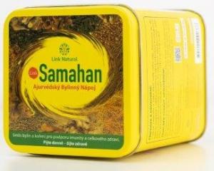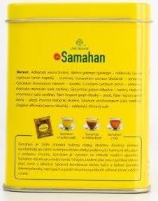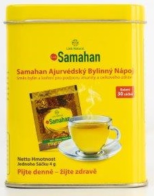 SAMAHAN čaj 150 kusů v kovové krabičce (5 x 30) čaj Samahan Samahan je koncentrovaný, vodou ředitelný rostlinný přípravek 14ti vybraných léčivých rostlin používaných po staletí v léčitelství. Na Srí-lance patří mezi prastaré receptury známé jako „Peyava. Přípravek se skládá z 14 různých... bylinných složek, včetně koření a přísad, které jsou používány jako každodenní kuchyňský přípravek na celém světě. Každý měsíc se na Srí Lance a v zemích, do nichž se Samahan vyváží (Velké Británii, USA, Austrálii, na Novém Zélandě, v Německu, Švýcarsku, Indii, Singapuru a na Blízkém východě), bezpečně spotřebuje více než 3 miliony sáčků tohoto čaje. Ročně je na celém světě vyvezeno a spotřebováno více než 50 milionů sáčků čaje Samahan. Ayurvédští lékaři doporučují Samahan jako pravidelné pití k zachování zdraví a zamezení vzniku onemocnění v důsledku posílení imunity díky vlastnostem čaje Samahan. PŮSOBENÍ: Aktivity jednotlivých rostlin jsou zkombinovány takovým způsobem, aby měly co nejlepší účinek v širokém rozsahu působností. Některé byliny působí v synergii a některé jako biologické zesilovače a přírodní konzervační látky, které produkt stabilizují. Samahan přináší účinnou a rychlou úlevu od symptomů běžného nachlazení, kašle, bolestí hlavy, bolestí těla a dalších potíží spojených s nastuzením. Preventivní účinek čaje Samahan může být výsledným efektem kombinace rostlin. Má analgetické, antipyretické, protizánětlivé účinky a usnadňuje vykašlávání a proto přináší úlevu u výše uvedených indikací. Protože čas Samahan podporuje imunitu, ajurvédští lékaři doporučují jeho pravidelné pití pro udržení zdraví a prevenci vzniku onemocnění. DOPORUČENÉ DÁVKOVÁNÍ: Obsah jednoho sáčku rozpusťte v polovině šálku (100 ml) horké vody, čaje, kávy nebo mléka. Samahan mohou užívat osoby jakéhokoli věku včetně dětí. Pro děti mladší pěti let použijte polovinu sáčku. SLOŽENÍ: Adhatoda vasica-kořen, Alpinia galanga-kořen/oddenek, Carum copticum-kořem/oddenek, Coriandrum sativum-semeno, Coscinium fenestratum-stopka, Cuminum cyminum-semeno, Evolvulus alsinoides-celá rostlina, Glycyrrhiza glabra-stopka, Hedyotis herbaceae-celá rostlina, Piper longum-plod, Piper nigrum-plod, Premna herbacea-kořen, Solanum xanthocarpum-celá rostlina, Zingiber officinale-kořen/oddenek.
